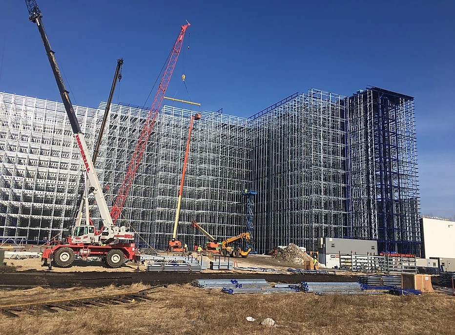 New construction of high cube and automated warehouses utilize the tall, intricate racking system for two purposes. The racks increase the efficiency of goods moving into and out of the warehouses, and serve as the building’s support structure, before being wrapped in a metal covering that acts as the building’s exterior walls. The racking system encompasses the entirety of the building’s height. The completed building photo below offers a glimpse of comparison to the height of a traditional warehouse. Traditional warehouses, found broadly throughout the Lehigh Valley, typically don’t exceed 50 feet, but the bottom photo shows how the 130-foot-tall building dwarfs the tractor-trailers at the first-floor bays.
