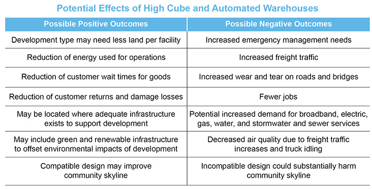 This emerging land use also has the potential for tremendous adverse impacts on the local and surrounding communities. Their high-tech automation means fewer jobs are created at the facility. Their height means drastic changes to landscapes in communities that have no other structures higher than three or four stories. These communities often do not have the emergency management service infrastructure necessary to serve structures of this scale, posing a threat to the public health, safety and welfare. While the efficiency of these facilities likely increases freight trips in and out of the site, the real impacts on traffic, and on the road and bridge infrastructure are not fully known because examples are not yet available to accurately assess trip generation. These factors will require proactive measures by municipal governments. Many of the impacts and recommendations detailed in this document could also apply to traditional warehouses and other industrial uses.
